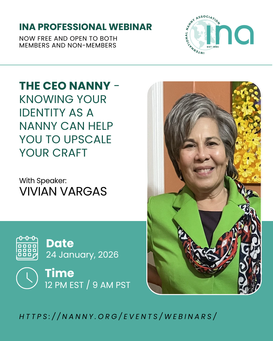 Description: Getting to know your strengths and flaws allows you to gain confidence with your job’s responsibilities. This webinar will support you in how to describe yourself as a nanny, and to create a “slogan” to describe you. You will create a list of your unique nanny traits, as well as find ways to improve your nanny vocational skills. Speaker: Vivian Vargas Short Bio: Vivi is the CEO Nanny, but before, she taught for twenty-five years. The pandemic was a catapult for many to look for new avenues and goals! She also took the challenge to navigate into the "Nanny World". What she loves about being a Nanny is that she can sync with parents to reach their goals. She has understood that the job is not about her. She also enjoys being a caregiver because daily obstacles are opportunities to use a "Plan B" and succeed. Finally, as a lifelong learner, she improves her craft to allow children to grow to be the best they can be. Vivi is an "Energizer Bunny" —she has been part of the Parent's and Teacher Association, Counselor for the Presidential Honor Society, Fundraiser for St. Jude and Juvenile Diabetes, Volunteers in libraries around the towns she babysits or Presides the Hispanic Baptist Women of New JerseyUBEMH (Facebook) or guides parents as an Early Intervention Teacher or Tutor. She is a busy bee and her new favorite place to learn has been becoming a member of INA. Future plans for her seem to be conducive to help parents to find jobs for their children with disabilities. She finds joy in assisting others to find the best in themselves, because she believes the world is a wonderful place to discover! We invite you to submit any questions for the speaker in advance using the form below: